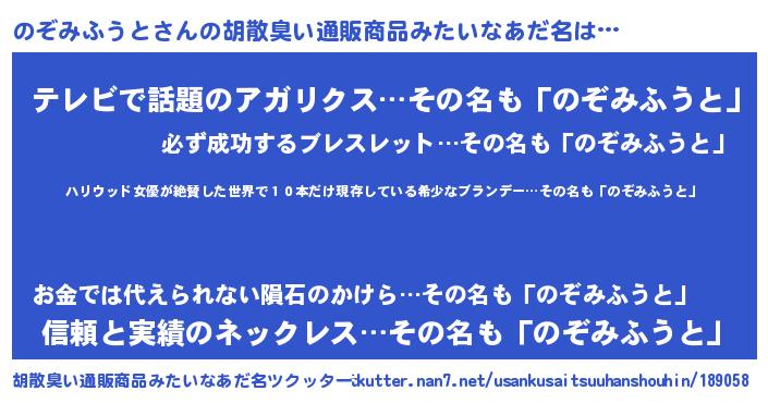 | 意味不明あだ名 | 『住所不定無職のぞみふうと(79歳)』 |