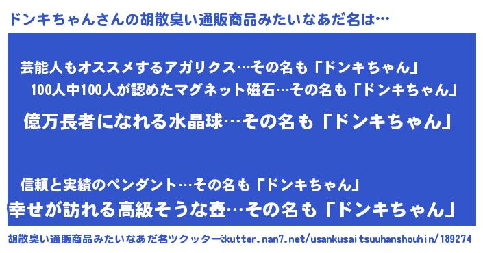 | 男性向けラノベタイトル風あだ名 | 『ドンキちゃんに滅ぼされるだけの簡単なお仕事です』 |