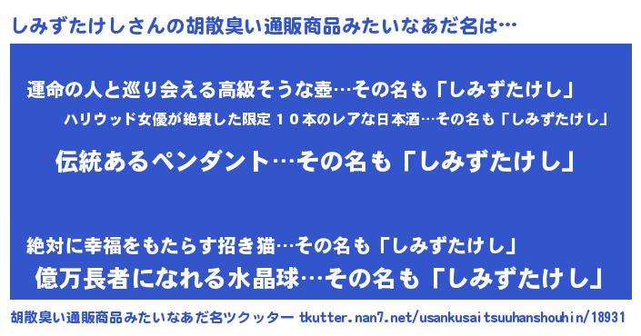 | 男性向けラノベタイトル風あだ名 | 『ダンジョンにしみずたけしを求めるのは間違っているだろうか』 |