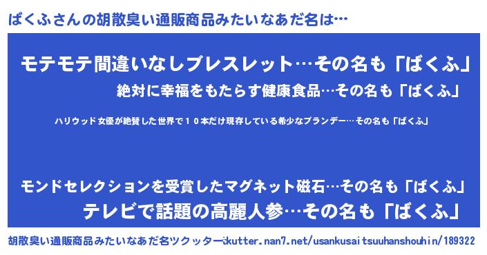 | 意味不明あだ名 | 『住所不定無職ばくふ(84歳)』『自称ばくふ』 |