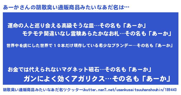 | 男性向けラノベタイトル風あだ名 | 『この素晴らしい世界にあーかを!』 |