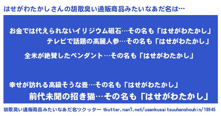 | 意味不明あだ名 | 『とにかく怪しいはせがわたかし』 |