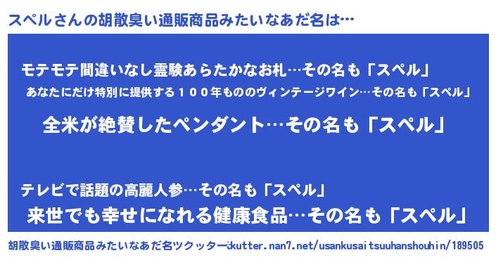 | 男性向けラノベタイトル風あだ名 | 『スペルの嫁は女の子じゃないと思った?』 |