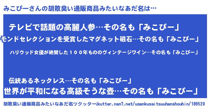 | 意味不明あだ名 | 『住所不定無職みこぴー(4歳)』 |