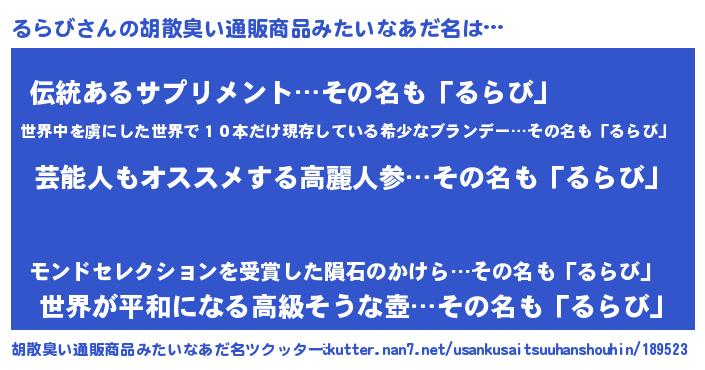 | 男性向けラノベタイトル風あだ名 | 『Re:るらびから始める異世界生活』 |