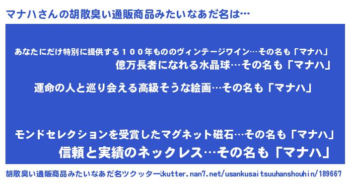 | ヘコむあだ名 | 『酢こんぶ』『マナお』『マナにー』 |