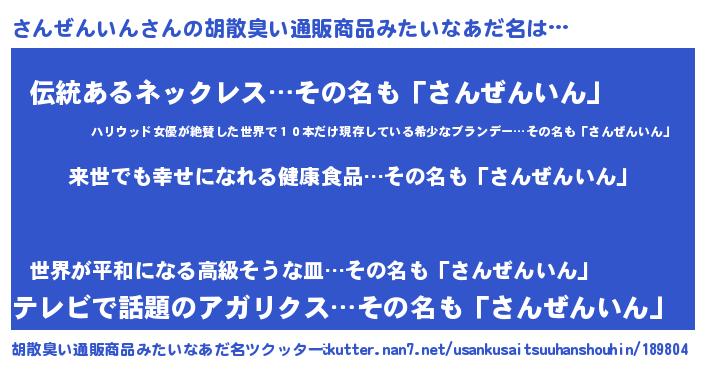 | 男性向けラノベタイトル風あだ名 | 『転生したらさんぜんいんだった件』 |