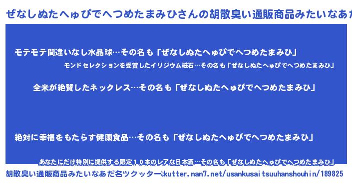 | 男性向けラノベタイトル風あだ名 | 『ぜなしぬたへゅぴでへつめたまみひの嫁は女の子じゃないと思った?』 |