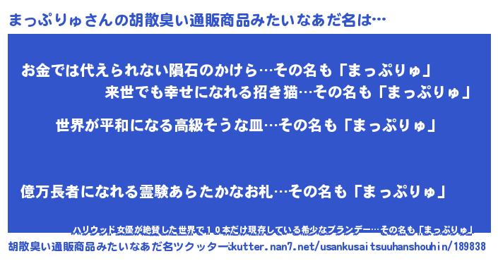 | 男性向けラノベタイトル風あだ名 | 『まっぷりゅに滅ぼされるだけの簡単なお仕事です』 |
