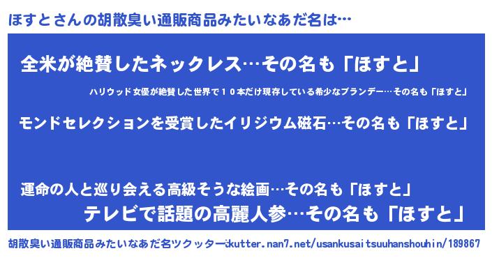 | ヘコむあだ名 | 『ほす太郎』『つくし』『ほすと(爆)』 |