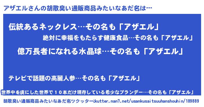 | 意味不明あだ名 | 『ペロリンアザエル』『永久保存アザエル』 |