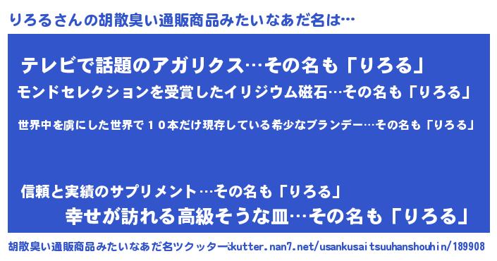| 男性向けラノベタイトル風あだ名 | 『りろるに滅ぼされるだけの簡単なお仕事です』 |