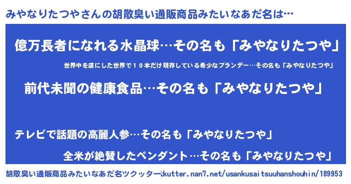 | ヘコむあだ名 | 『みやなりたつや(笑)』『みやもー』 |