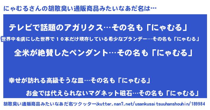 | 男性向けラノベタイトル風あだ名 | 『にゃむるの嫁は女の子じゃないと思った?』 |