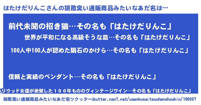 | ヘコむあだ名 | 『はたけだりんこ(震え声)』『豆乳』 |