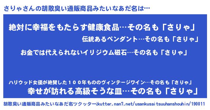 | 男性向けラノベタイトル風あだ名 | 『転生したらさりゃだった件』 |