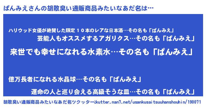 | 意味不明あだ名 | 『永久保存ぱんみえ』『自称ぱんみえ』 |