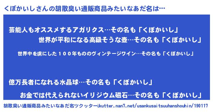 | 意味不明あだ名 | 『住所不定無職くぼかいし(8歳)』 |
