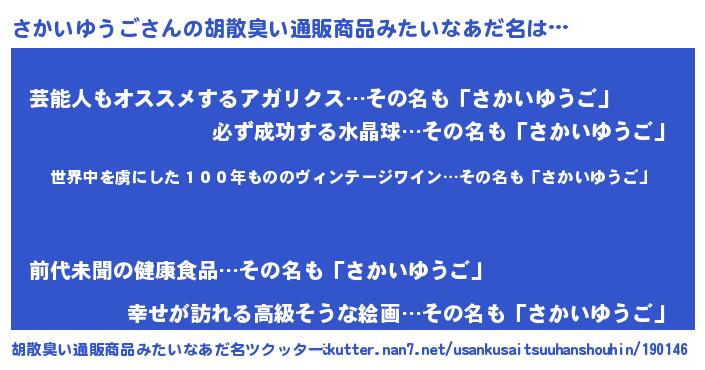 | 男性向けラノベタイトル風あだ名 | 『転生したらさかいゆうごだった件』 |