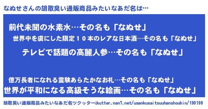 | 男性向けラノベタイトル風あだ名 | 『Re:なぬせから始める異世界生活』 |