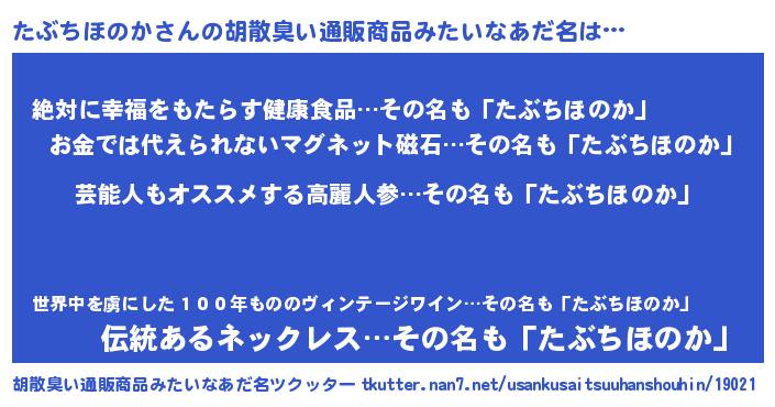 | ヘコむあだ名 | 『たぶちほのか(小並感)』『たぶお』 |