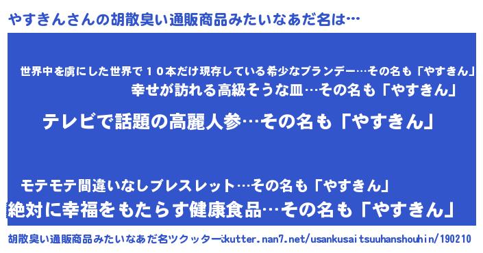 | 意味不明あだ名 | 『自称やすきん』『もやし科やすきん属』 |