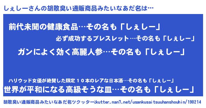 | 意味不明あだ名 | 『自称しぇしー』『永久保存しぇしー』 |