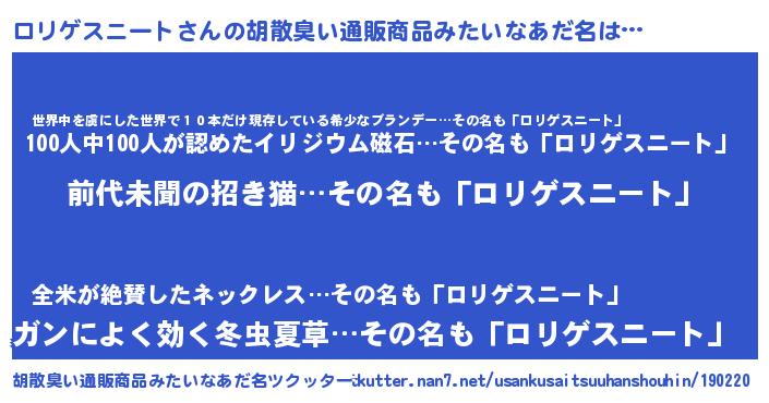 | 意味不明あだ名 | 『永久保存ロリゲスニート』 |
