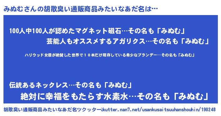 | 意味不明あだ名 | 『住所不定無職みぬむ(84歳)』『自称みぬむ』 |