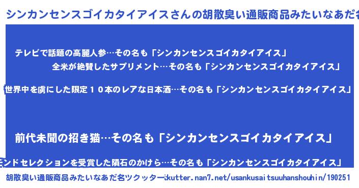 | 男性向けラノベタイトル風あだ名 | 『シンカンセンスゴイカタイアイスに滅ぼされるだけの簡単なお仕事です』 |