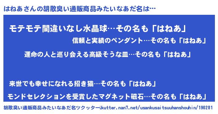 | ヘコむあだ名 | 『酢こんぶ』『はねにー』『はねを』 |