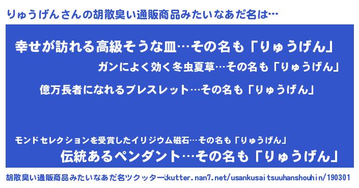 | 意味不明あだ名 | 『ペロリンりゅうげん』『自称りゅうげん』 |