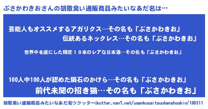 | ヘコむあだ名 | 『ぶさかわきお(笑)』『ぶさ太郎』 |