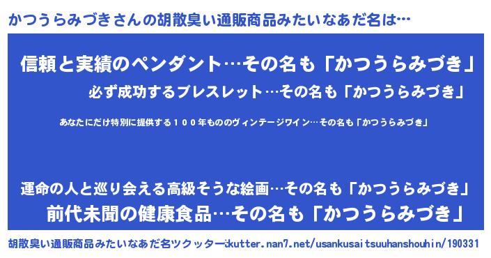 | 意味不明あだ名 | 『住所不定無職かつうらみづき(4歳)』 |