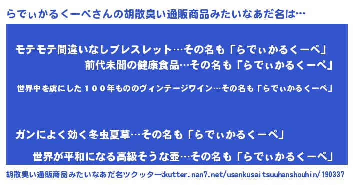 | 意味不明あだ名 | 『住所不定無職らでぃかるくーぺ(4歳)』 |