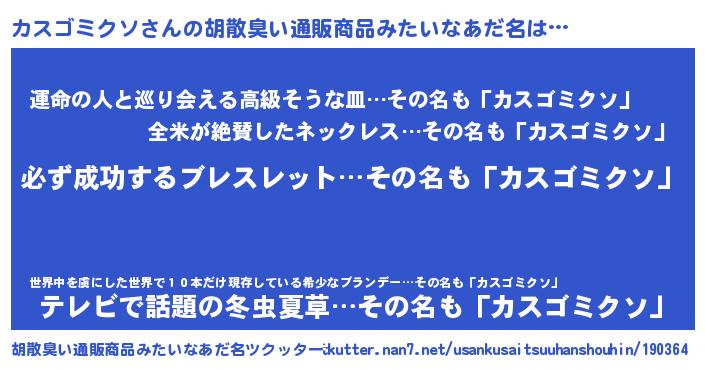 | ヒーロー風カッコイイあだ名 | 『スーパーカスゴミクソ』『天弓騎士カス』 |