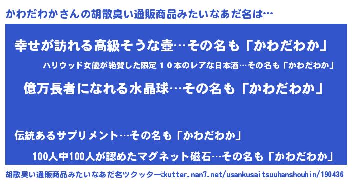 | ファンタジー風あだ名 | 『カワフェル』『エターナルカワダワカー』 |