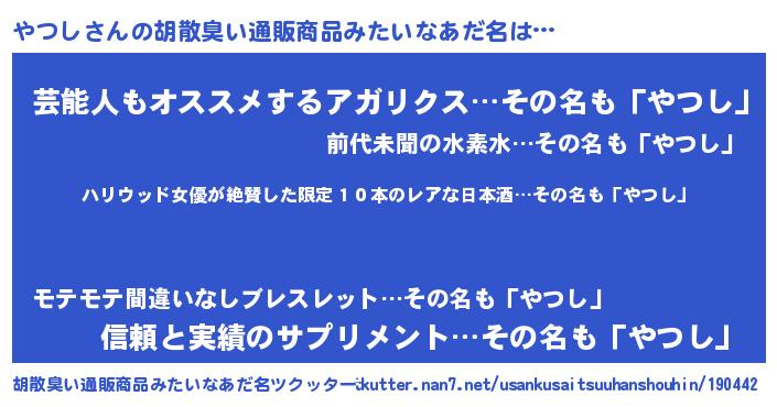 | 意味不明あだ名 | 『住所不定無職やつし(43歳)』『自称やつし』 |