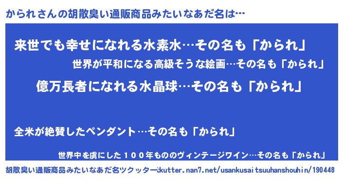 | ヘコむあだ名 | 『からにゅー』『かられ(遠い目)』 |