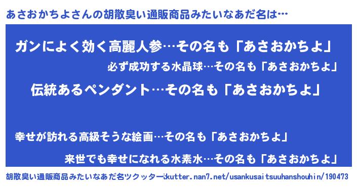 | 意味不明あだ名 | 『とにかく怪しいあさおかちよ』 |