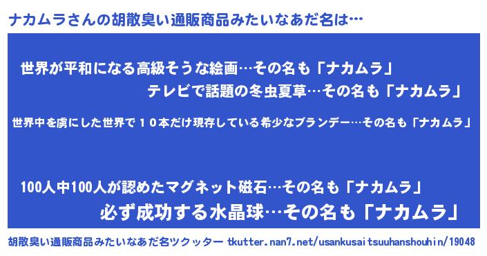| 男性向けラノベタイトル風あだ名 | 『魔弾の王とナカムラ』『ナカムラの憂鬱』 |