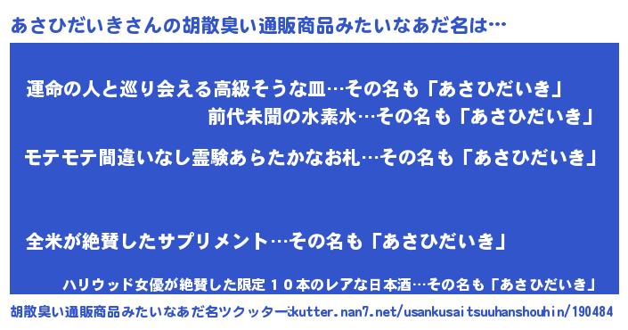 | 男性向けラノベタイトル風あだ名 | 『アサヒダイキアートオンライン』 |