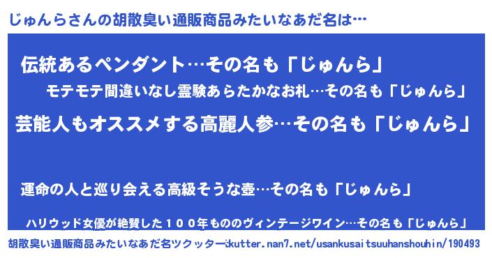 | 意味不明あだ名 | 『ニラ科じゅんら属』『自称じゅんら』 |