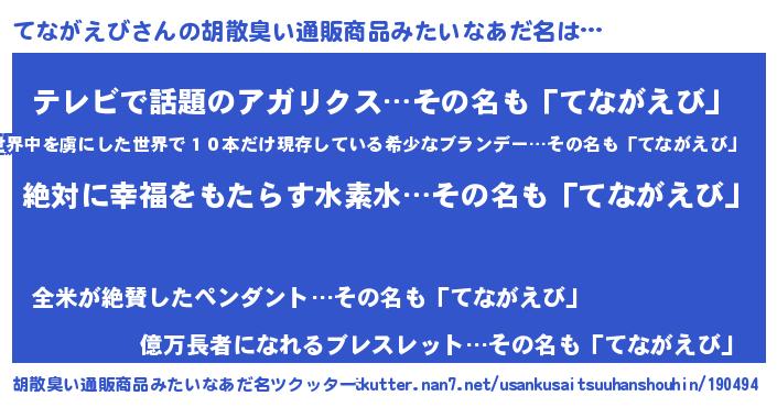 | 男性向けラノベタイトル風あだ名 | 『てながえびという概念が存在しない退屈な世界 』 |