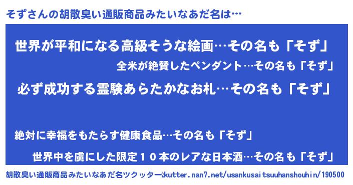 | 男性向けラノベタイトル風あだ名 | 『そずの憂鬱』『はたらくそずさま!』 |