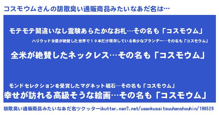 | 恥ずかしいあだ名 | 『コスリンリン』『プリティーコスモウム』 |