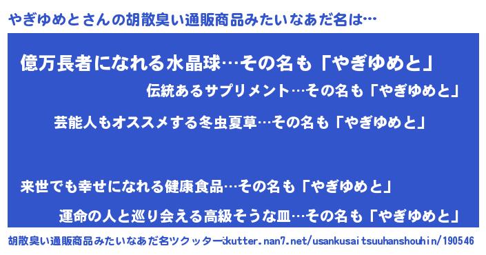 | 男性向けラノベタイトル風あだ名 | 『やぎゆめと~年齢イコール彼女いない歴の魔法使い~』 |