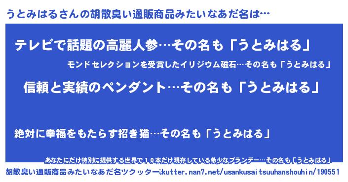 | ヘコむあだ名 | 『うとぷりん』『うとみはる(笑)』 |