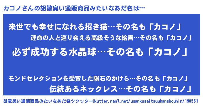 | 意味不明あだ名 | 『ペロリンカコノ』『永久保存カコノ』 |