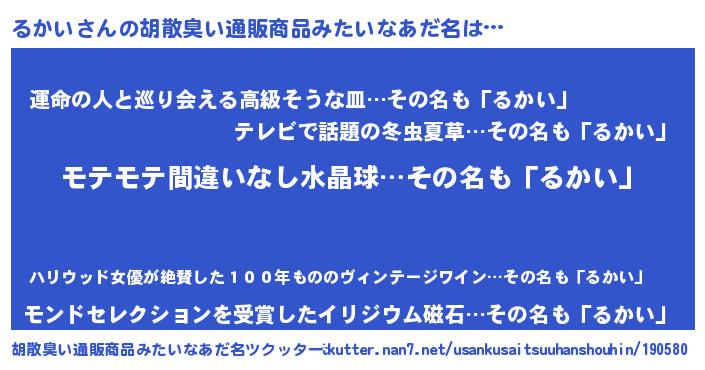 | 意味不明あだ名 | 『ペロリンるかい』『るかいフォーエバー』 |
